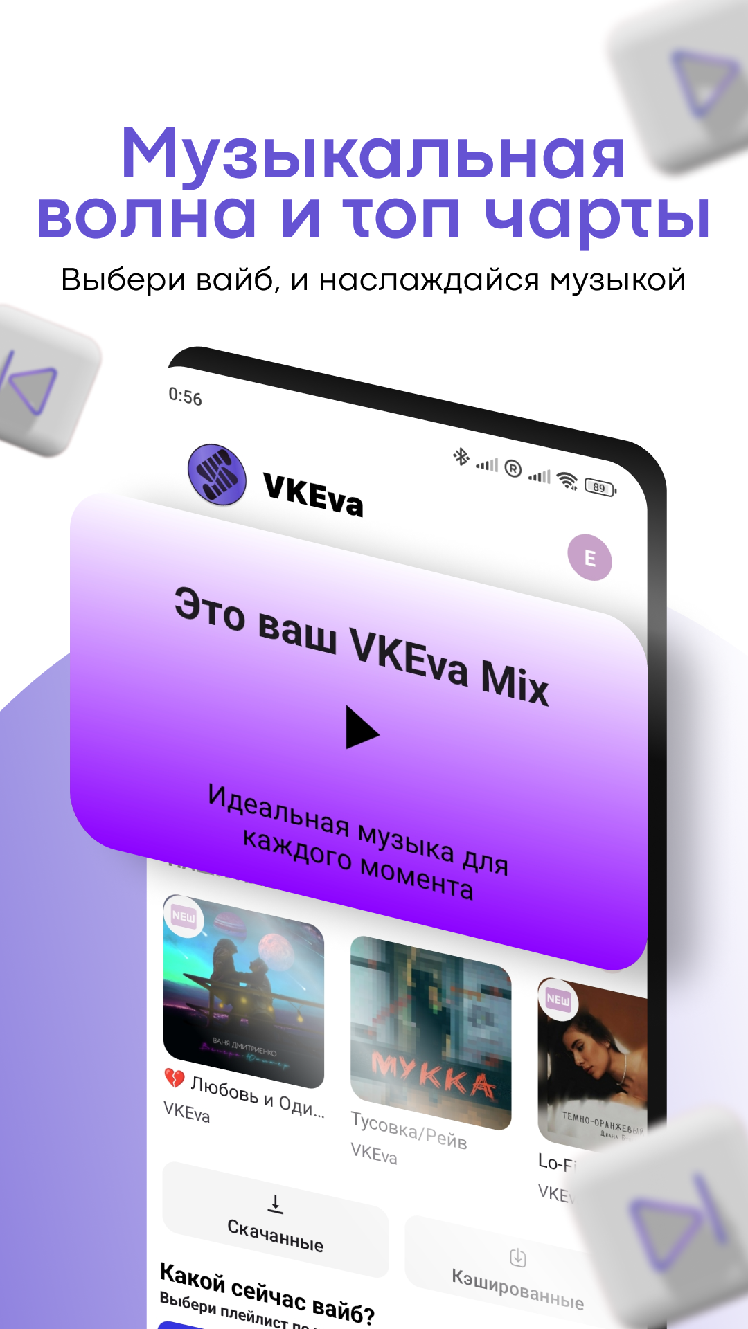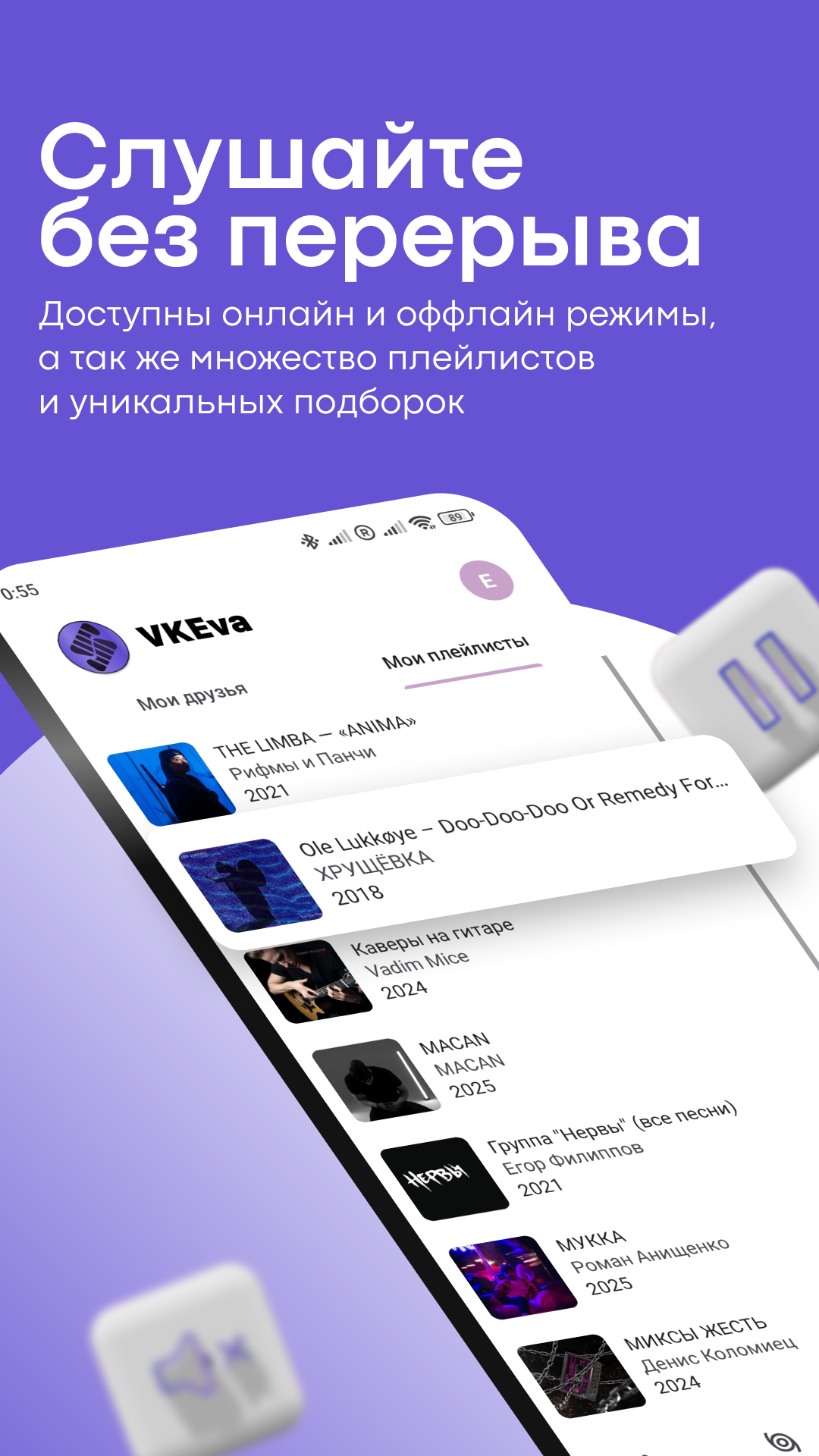 VKEva — твоя персональная музыкальная вселенная. Это умное приложение, которое подстраивается под твои вкусы и настроение.
